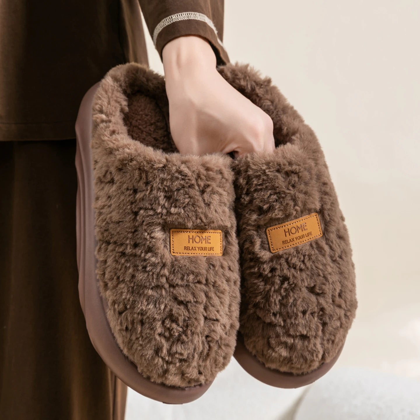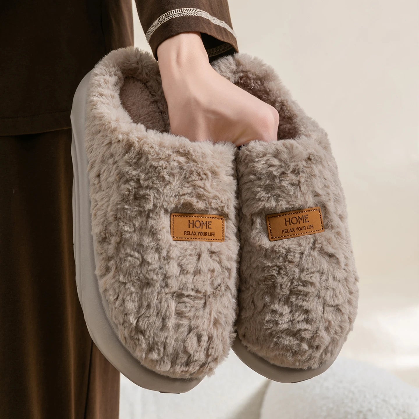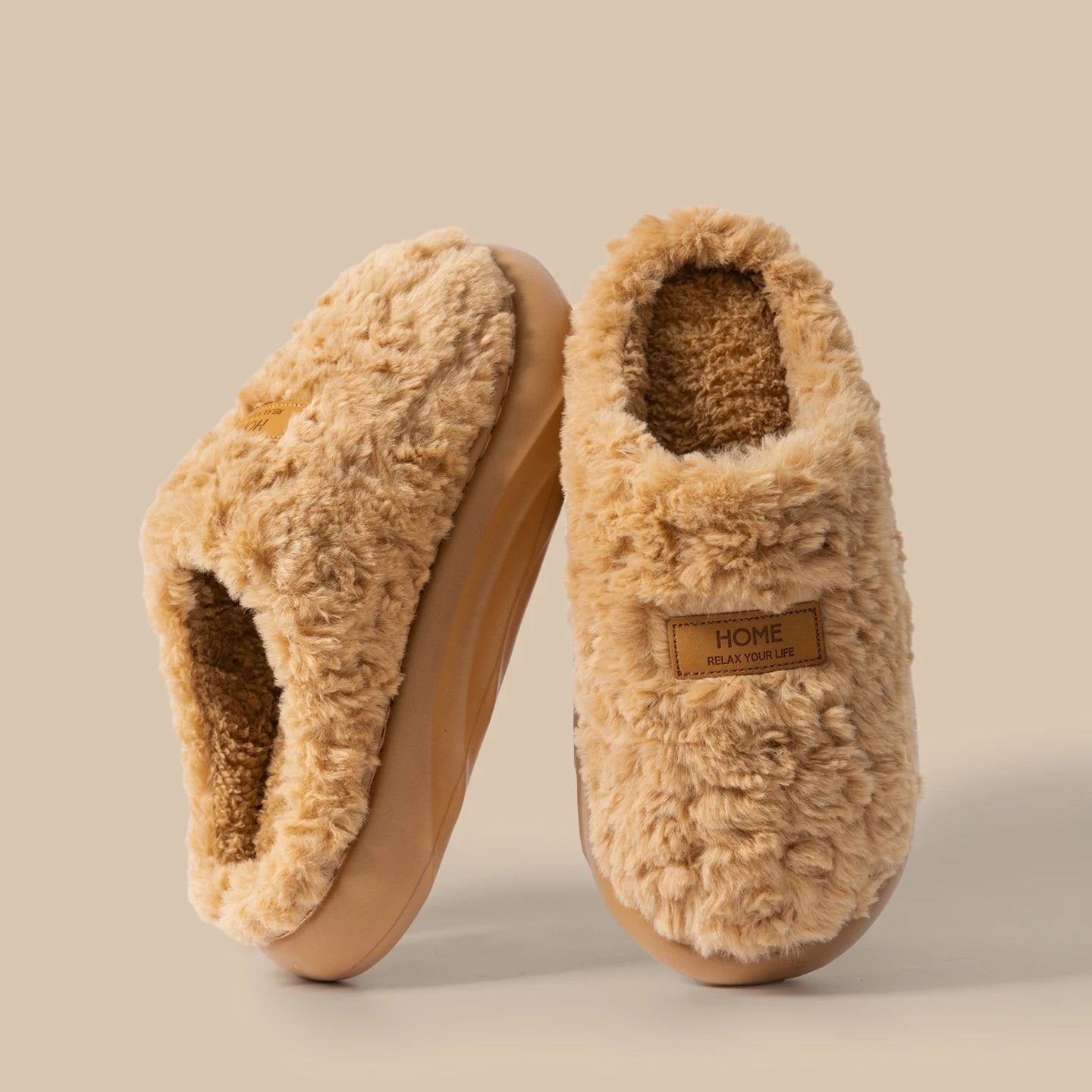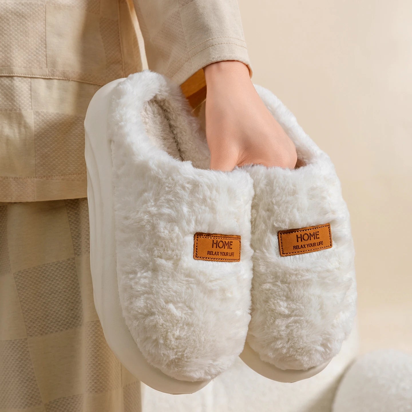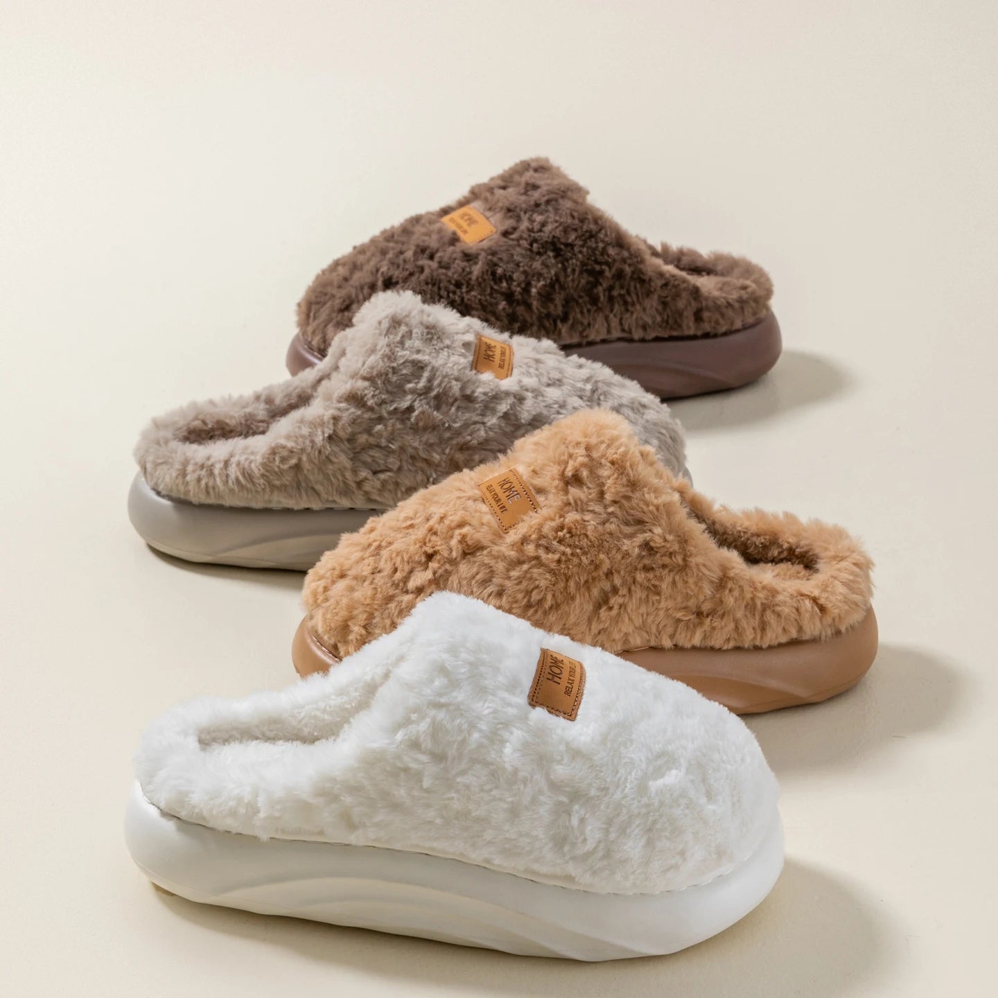 Flauschige Damenhausschuhe aus Polyester mit weichem Plüsch-Futter und EVA-Sohle. Zum Überziehen, perfekt für Zuhause. Flacher Absatz, angenehmer Tragekomfort. Erhältlich in den Größen 36–45.